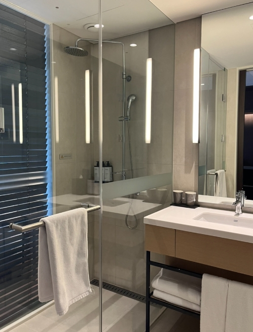 욕실 구조 또한 만족스러웠습니다. 샤워실, 세면대, 화장실이 각각 분리되어 있어 동행인과 함께 사용할 때도 불편함이 없었고, 전체적으로 위생적으로 잘 관리된 느낌이 들었습니다.