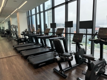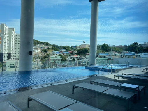 호텔 6층에는 헬스장과 수영장이 마련되어 있었어요. 먼저 헬스장의 경우, 공간이 넓진 않지만 기본적인 유산소 운동 기구인 런닝머신과 사이클, 간단한 상체 운동 기구들이 갖춰져 있어 간단한 운동을 하기엔 충분했습니다. 다만 운동복이나 운동화는 개인이 따로 준비해야 하니 미리 챙겨가시길 권장드려요.