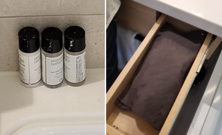 샤워부스 안에는 바디워시, 샴푸, 컨디셔너가 구비되어 있었고, 어메니티는 '엘리멘탈 허브올로지'라는 고급 브랜드로 준비되어 있어서 사용감도 만족스러웠습니다. 세면대 위에는 기본 비누와 휴지가 있었고, 서랍 안에는 칫솔, 면도기, 드라이기 등 일회용 키트가 알차게 들어 있어 따로 챙겨올 필요 없이 편리하게 이용할 수 있었어요.