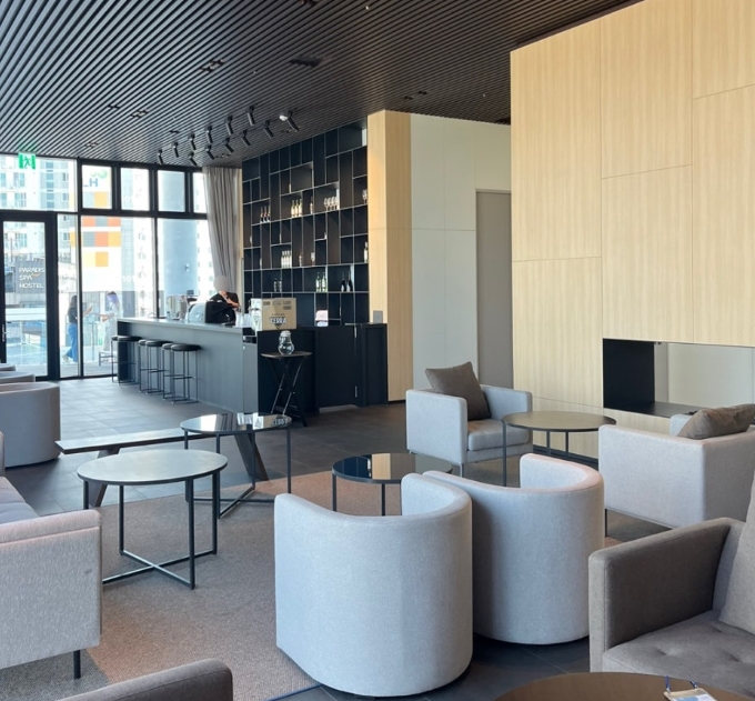 6층에 위치한 로비는 생각보다 넓고 환한 분위기로 꾸며져 있어 정말 좋았습니다. 특히 로비 한쪽 벽면이 통유리로 되어 있어 자연광이 듬뿍 들어오는 구조였고, 소파와 테이블이 넉넉하게 배치되어 있어 체크인 대기 중에도 불편함 없이 쉴 수 있었어요.