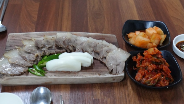 가장 먼저 나온 건 바로 돔베고기였어요. 얇고 적당한 크기로 썰린 고기는 반들반들 윤기가 흐르고 있었고, 간장 소스와 함께 양파, 땡초, 쌈장이 곁들여져 입맛을 확 돋워주더라고요.