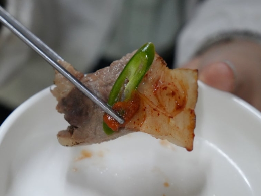 무엇보다 인상적이었던 건 고기의 식감과 냄새였습니다. 전혀 누린내 없이 부드럽고 촉촉하게 씹히는 식감, 그리고 비계와 살코기가 적절히 어우러진 구성은 정말 잘 삶아진 돔베고기의 정석 그 자체였어요.
