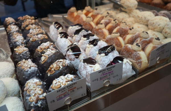 제주 특산물을 활용한 빵 종류가 참 다양해서 고르기 어려울 정도였는데, 결국 선택한 건 ‘우도 땅콩 크림 도너츠’와 ‘오메기떡 소보로 도너츠’.