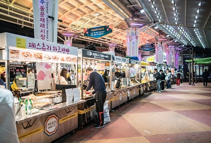 밤이 되면 동문시장은 또 다른 얼굴을 보여줍니다. 낮에는 장을 보는 어르신들과 관광객들로 북적이지만, 해가 지면 네온사인 아래 힙한 먹거리들이 쏟아져 나오고, 분위기는 점점 활기차고 흥미로워져요. 한 바퀴 돌기만 해도 흥분되는 그 기분, 딱 ‘여행 왔구나’ 싶더라고요.