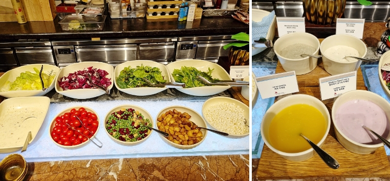 조식 뷔페 구성은 정말 다양했습니다. 한식, 양식, 일식 메뉴가 고루 준비되어 있었고, 신선한 과일과 샐러드, 갓 구운 빵, 따끈한 국물 요리까지 한 자리에서 모두 즐길 수 있었어요.