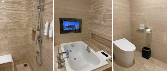 욕실은 세면대, 샤워부스, 화장실이 모두 분리되어 있어 사용하기 굉장히 편리했어요. 특히 샤워부스 안에는 큰 욕조와 벽걸이 TV까지 설치되어 있어서, 따뜻한 물에 몸을 담그고 TV를 보면서 스파를 즐기는 최고의 힐링 시간을 보낼 수 있었답니다.