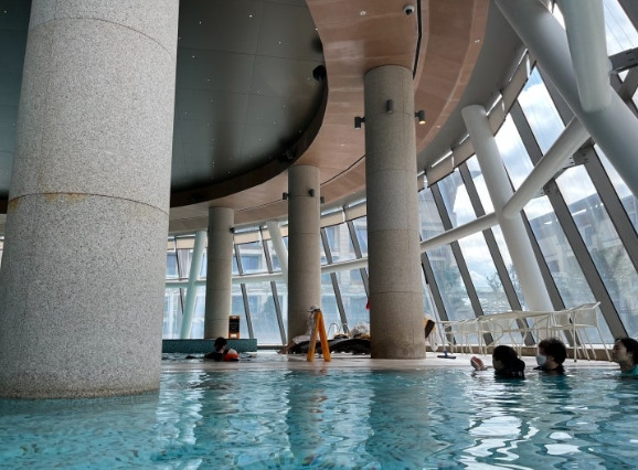 한쪽 벽면이 유리창으로 되어 있어 자연광이 가득 들어오고, 실내 온수풀 덕분에 추운 겨울에도 따뜻하게 물놀이를 즐길 수 있었습니다.