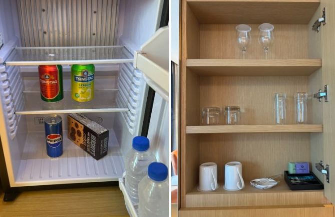 물컵과 커피잔도 깔끔하게 준비되어 있었고, 미니바에는 웰컴 생수와 다양한 음료, 간식거리가 1회 무료로 제공되어서 가볍게 즐기기에 좋았습니다.