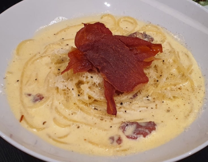 까르보나라는 크리미하면서도 느끼하지 않고, 짭짤한 프로슈토와 환상적인 조화를 이뤘습니다. 면 사이사이에 소스가 잘 배어 있어서, 마지막 한 젓가락까지도 만족스러웠어요.