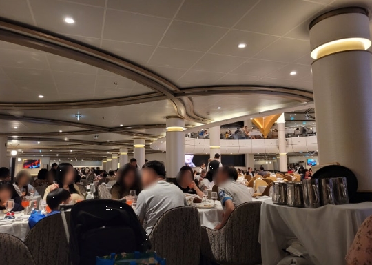 기본 식사는 메인 다이닝홀에서 제공되며, 이탈리안 요리부터 아시안 퓨전까지 다양하게 구성되어 있었습니다. 특히 스테이크와 해산물 요리가 인상 깊었어요.