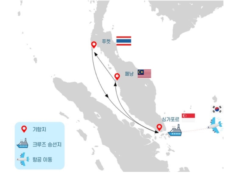 탑승 전 싱가포르에서 하루 정도 여유롭게 시티 투어를 즐길 수 있었고, 본격적인 항해는 싱가포르 – 페낭 – 푸켓 – 싱가포르 순으로 이어졌습니다. 크루즈 일정은 비교적 여유 있게 구성되어 있어 도시 체험과 선내 활동을 균형 있게 즐길 수 있었습니다.