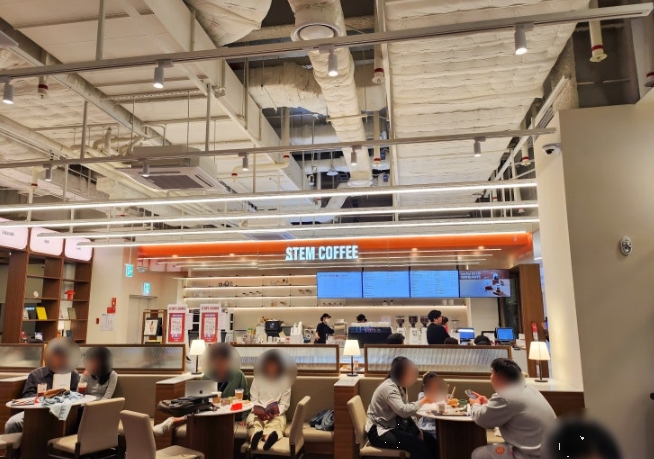에스컬레이터를 타고 복도를 걷다 보면 저절로 눈에 띄기 때문에 지나가는 사람들의 시선을 끌 수밖에 없는 카페입니다.