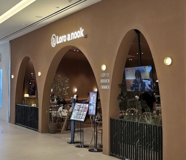로로아녹은 스타필드 수원 3층, 스파오 매장 왼편에 위치한 브런치 카페로, 인디핑크 컬러의 외관과 아치형 입구가 정말 인상적이에요.