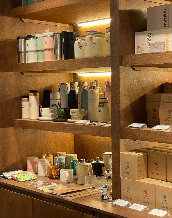 벽면 한쪽에는 굿즈와 디저트들이 진열되어 있었는데, 군더더기 없이 깔끔한 디자인이 정말 마음에 들었어요. 특히 컵 같은 소품들은 실용적이면서도 감각적인 디자인 덕분에 선물용으로도 좋을 것 같았습니다.