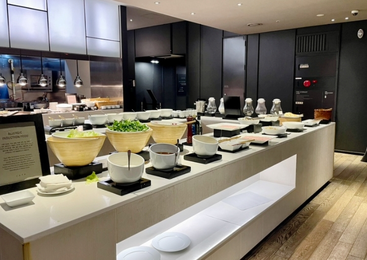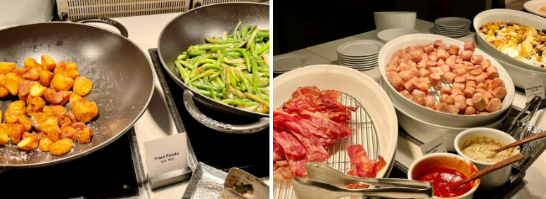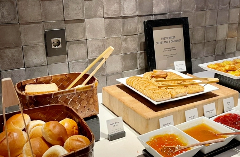 빵 코너에는 크루아상, 페스츄리류, 치아바타, 식빵 등이 다양하게 준비되어 있어 취향에 맞게 선택할 수 있었습니다. 과일 코너에는 오렌지, 냉동망고 등 신선한 과일이 제공되어 상큼한 마무리를 할 수 있었습니다.