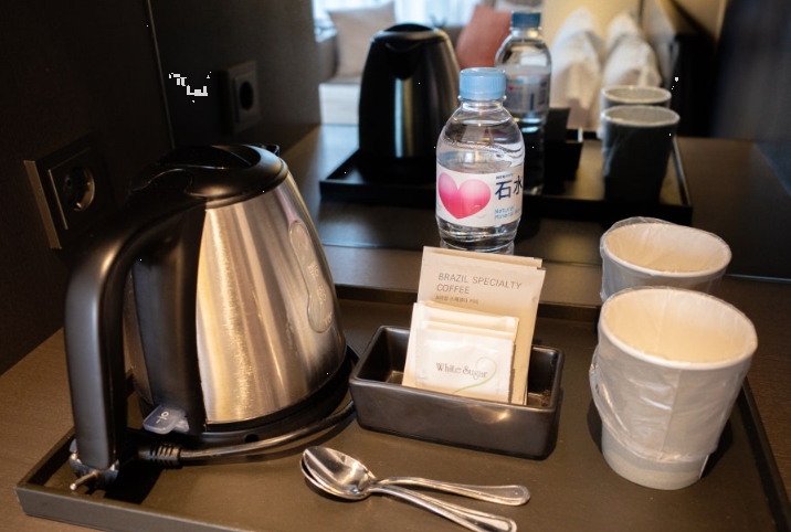 객실 내에는 커피, 홍차, 녹차 티백과 함께 생수 두 병이 제공되었습니다. 특히, 한 병은 냉장고에, 다른 한 병은 상온에 보관되어 있어 필요에 따라 선택하여 마실 수 있었습니다. 커피포트를 이용해 따뜻한 커피를 즐기며 여유로운 시간을 보낼 수 있었습니다.