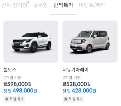 쏘카 앱에 접속해 ‘쏘카플랜’ 메뉴를 누르면 원하는 차종과 조건을 선택할 수 있어요. ‘새 차’, ‘내일 받기’, ‘특가’, ‘모두 보기’ 등으로 구분되어 있어 필요한 조건에 따라 골라볼 수 있답니다. 저는 여행용으로 연비 좋고 트렁크가 넉넉한 중형 세단을 선택했어요.