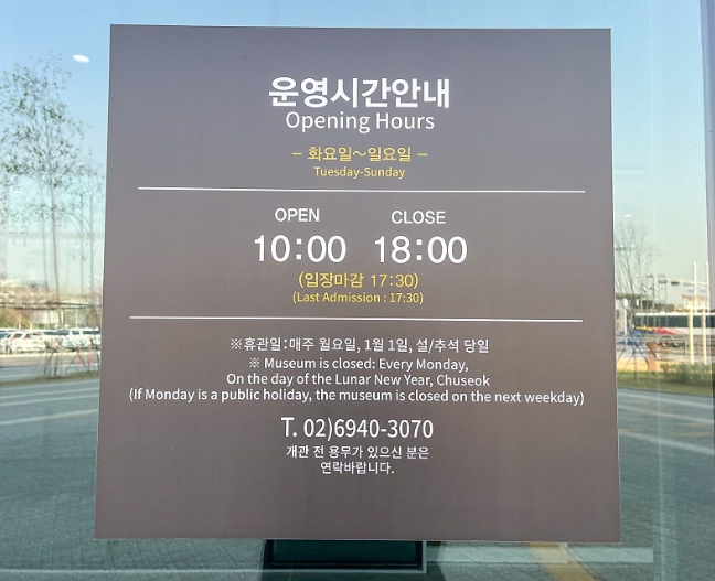 휴관일: 매주 월요일, 1월 1일, 설날 및 추석 당일