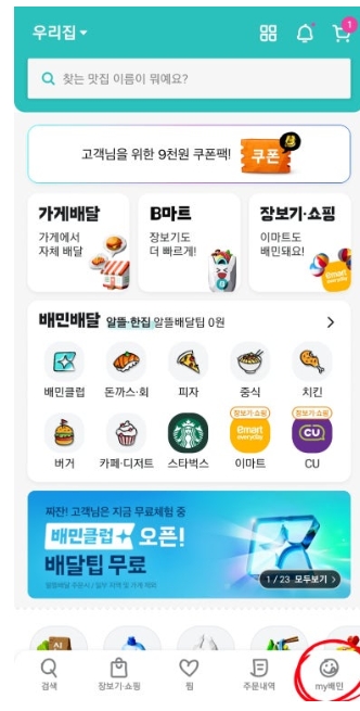 배민 앱 실행 → 우측 하단 'my배민' 클릭