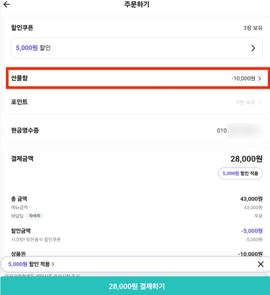 상품권을 등록하고 나면 실제 결제할 때 잔액이 자동 차감되는 방식이라 매우 편리해요. 저는 마침 점심시간에 짬이 나서 배달음식을 주문하면서 사용해 봤는데요,