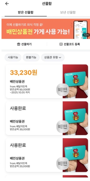 선물 받은 상품권은 배민 앱에 등록해야 사용할 수 있어요. 등록 방법도 정말 간단했답니다.