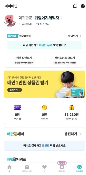 배민 앱 실행 → 우측 하단 'my배민' 클릭