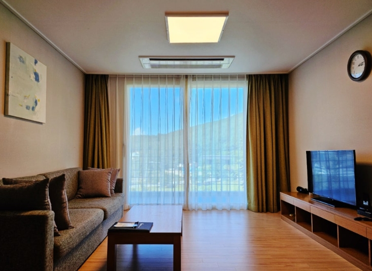 제가 이용한 블루동 4인 객실은 거실, 방 1개, 주방, 화장실로 구성된 전형적인 가족형 구조였습니다. 객실 문을 열자마자 넓고 쾌적한 거실 공간이 눈에 들어오고, 따뜻한 조명과 깔끔한 가구 배치가 첫인상을 좋게 만들어주었어요.