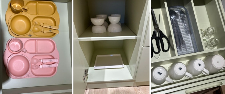 아이 식기류뿐 아니라 어른용 식기도 갖춰져 있어서 컵이나 접시 등은 따로 챙기지 않아도 됩니다. 전자레인지도 방 안에 비치되어 있어 접근성이 좋아요.