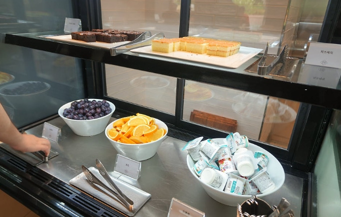 저는 단품 메뉴로 속을 채운 뒤, 후식으로는 샐러드바에서 과일과 케이크를 담아오고, 커피 한 잔을 곁들여 아침을 여유롭게 마무리했습니다.