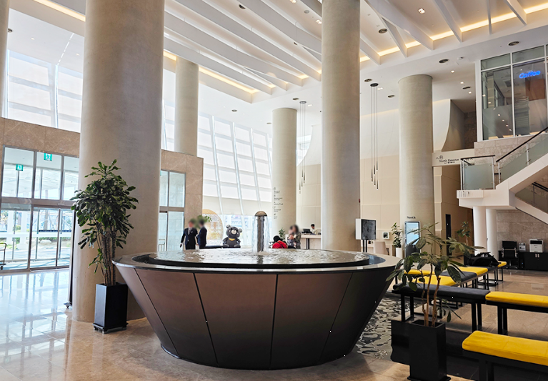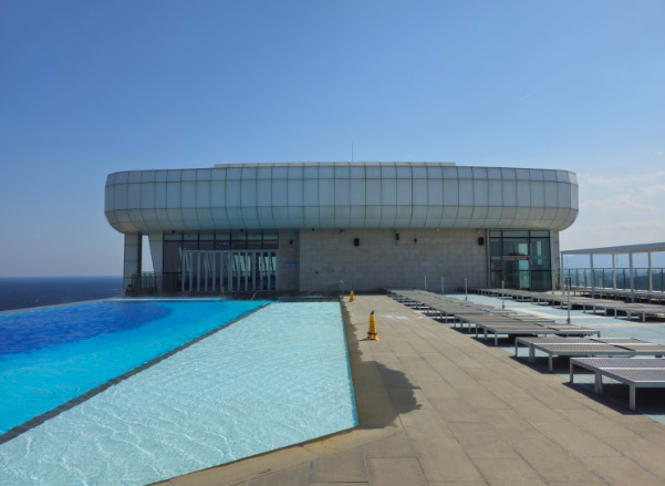 외관은 고급스러운 유리 건물로, 탁 트인 디자인이 바다를 더 잘 보여주는 구조예요. 건물 자체가 마치 유람선처럼 둥글게 설계돼 있어서 어떤 방향에서든 바다를 볼 수 있다는 게 가장 큰 장점이죠.