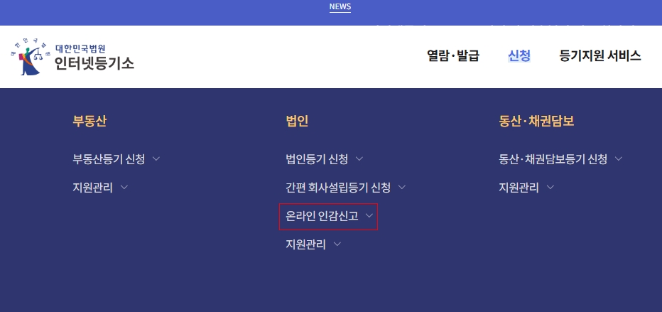 -> 상단 메뉴 ‘신청’ > ‘온라인 인감신고’ 클릭