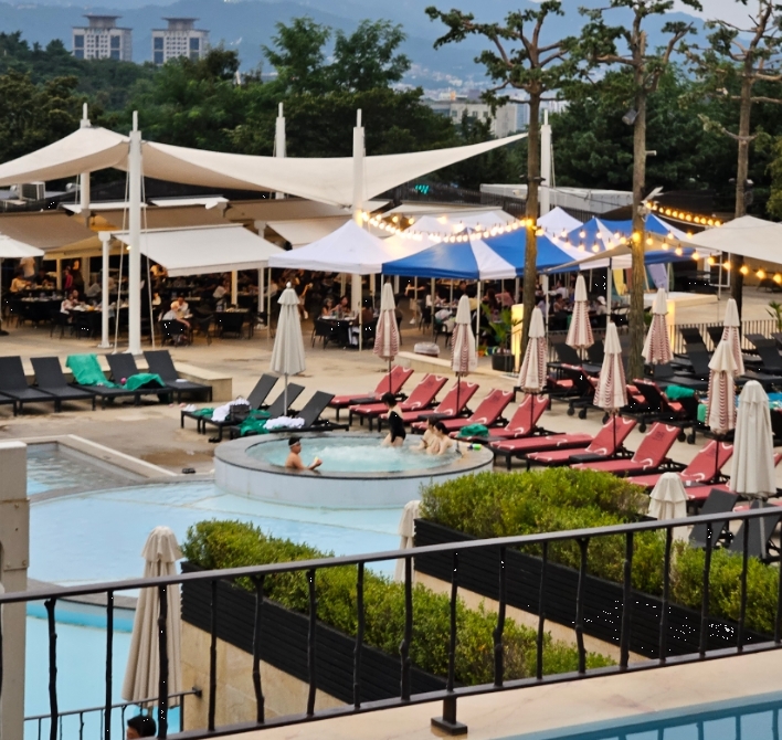 가장 눈에 띄는 건 바로 침대 옆으로 이어진 대형 라운지 풀. 수온도 적당하게 따뜻해서 아침이든 밤이든 언제든 들어가도 부담이 없었고, 물속에서 남산을 바라보는 그 풍경이 정말 멋졌어요.