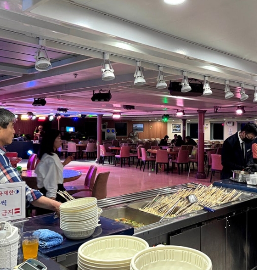 크루즈 내부는 생각보다 훨씬 깔끔하고 쾌적했어요. 각 객실 외에도 공용 공간이 잘 마련되어 있어서 이동 중에도 지루하지 않았어요. 식당, 편의점, 게임룸, 노래방 같은 시설이 있어서 시간을 보내기에도 좋았고요.