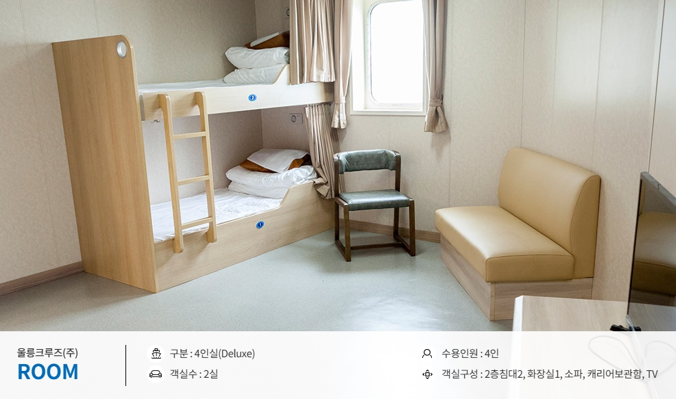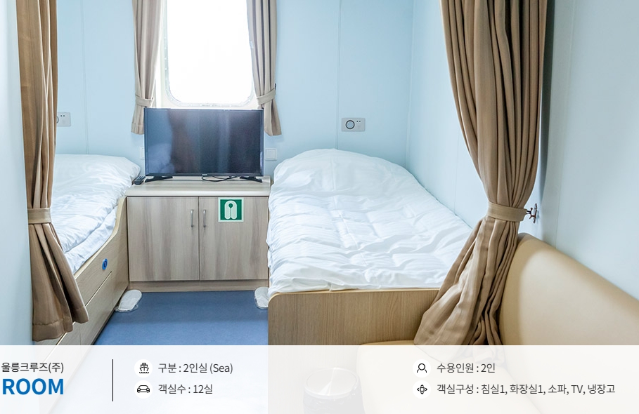 저는 포항에서 울릉도로 가는 크루즈를 선택했어요. 울릉크루즈 공식 홈페이지에서 일정을 확인하고 여행 예매사이트에서 간단했어요. 여행일과 인원수를 선택하면 객실 옵션이 쭉 뜨는데, 인사이드와 씨사이드 객실로 나뉘어 있었어요.