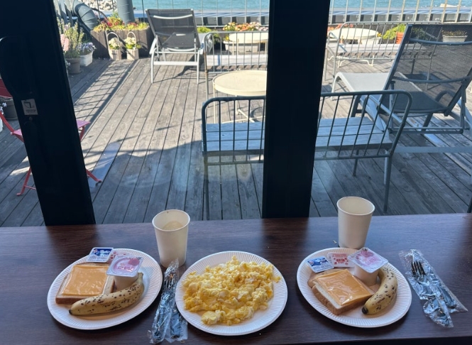 루프탑이 특히 좋았어요. 밤에는 별과 함께 야경을 감상하고, 낮에는 바다 내음을 맡으며 책을 읽는 시간이 너무 좋았답니다. 조식은 포함 예약 시 간단한 뷔페 형태로 제공되는데, 토스트, 계란, 과일, 샐러드 등으로 구성돼 있어 든든했어요.