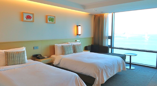 객실 문을 열자마자 정면에 펼쳐진 바다가 저를 맞이했어요. 침대 정면이 전면 유리창으로 되어 있어서 침대에 누운 채 바다를 감상할 수 있었어요.
