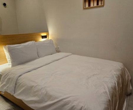 더블베드 구성으로 친구와 함께 묵기에 좋았고, 침대 옆에 간단한 조명과 스탠드, 화장대도 있었어요.