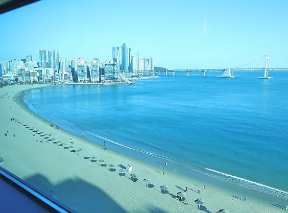 제가 묵은 스위트룸은 월풀 욕조가 있는 방이었어요. 문을 여는 순간 커다란 창 너머로 해운대 바다가 파노라마처럼 펼쳐져요.