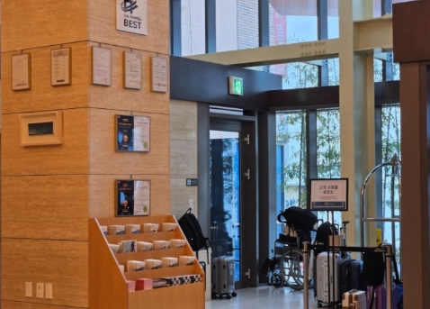 로비에 들어서는 순간 시원한 에어컨 바람과 바다 내음이 함께 느껴졌어요. 프론트 직원은 무척 친절하고 안내도 상세했어요. 저는 온라인 요청으로 조기 체크인을 시도했는데, 다행히 14시에 방을 받을 수 있었답니다. 대기 중 로비에 마련된 좌석에서 해운대 풍경이 담긴 인테리어와 사진 포인트도 여유롭게 즐길 수 있었어요.