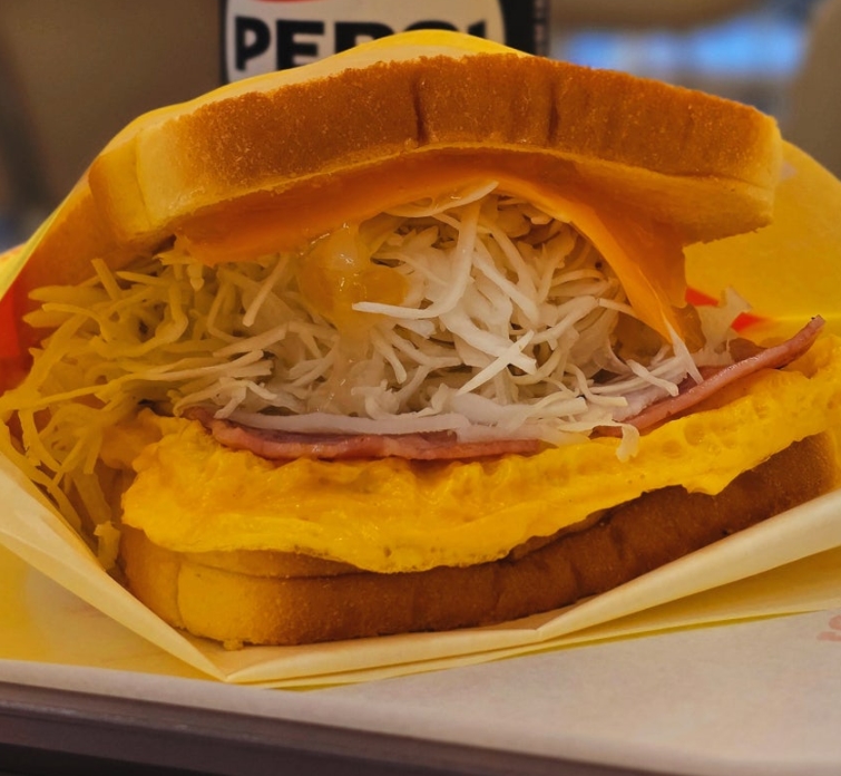 슬라이스 햄, 계란, 치즈, 양배추, 콘샐러드가 식빵 사이에 꽉 채워져 있고, 이삭 특제 소스가 부드럽게 더해져 있어요.