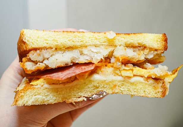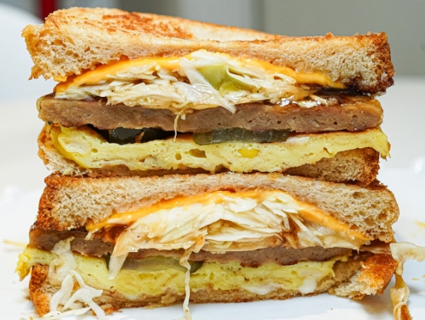 이 메뉴는 바삭한 식빵 사이에 베이컨, 계란, 치즈, 양배추가 들어가고, 마무리는 이삭의 시그니처인 복숭아잼 소스로 달콤하게 마무리됩니다.