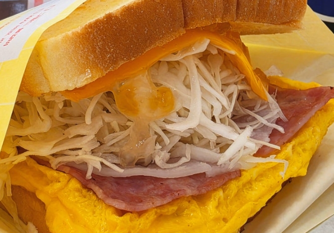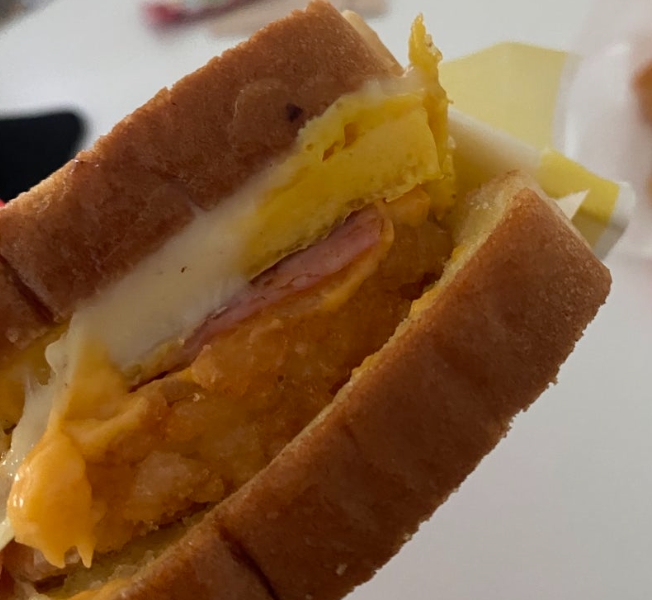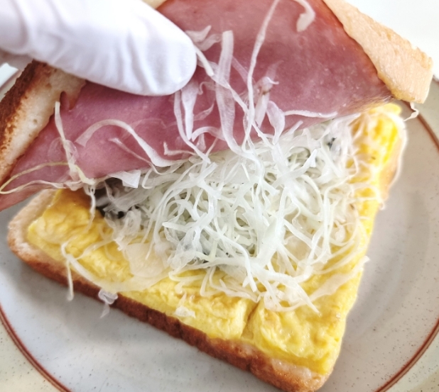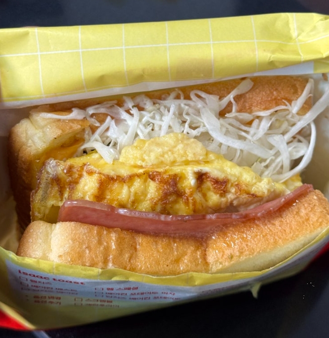 이 메뉴는 바삭한 식빵 사이에 베이컨, 계란, 치즈, 양배추가 들어가고, 마무리는 이삭의 시그니처인 복숭아잼 소스로 달콤하게 마무리됩니다.