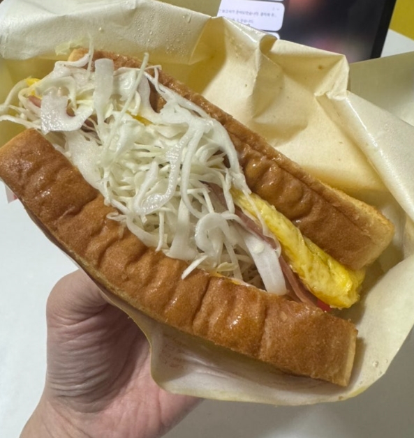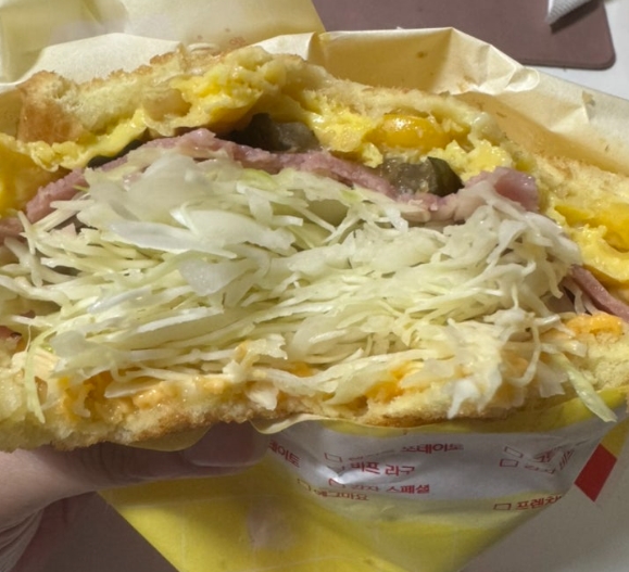 슬라이스 햄, 계란, 치즈, 양배추, 콘샐러드가 식빵 사이에 꽉 채워져 있고, 이삭 특제 소스가 부드럽게 더해져 있어요.