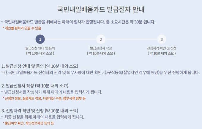 국민내일배움카드를 신청하기 위해서는 HRD-NET 홈페이지를 방문하여 회원가입을 한 후 신청서를 작성해야 합니다. 전체적으로 30분 정도의 시간이 소요되지만 개인별로 상이할 수 있으니 참고하시기 바랍니다.
