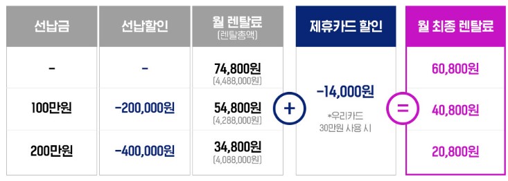 - 선납금 옵션 선택: 선납금을 지불하여 렌탈료를 더 줄일 수 있습니다.