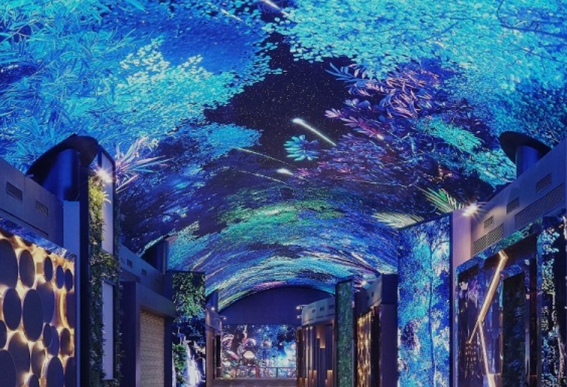 오로라는 150m길이의 디지털 엔터테인먼트 거리로, 곡선 형태의 높이 25m 천장과 벽면을 따라 설치된 초고화질 LED 사이니지를 통해 가상 공간의 경계를 넘나드는 듯한 압도적인 몰입감을 선사해드립니다.