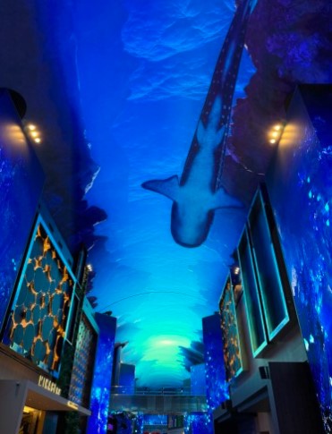 오로라의 메인 영상인 '언더 더 블루랜드'는 미지의 섬을 찾아 나서는 여정을 담고 있습니다. 바닷속을 유영하는 고래와 아름다운 해양 생물들이 그림 같은 풍경을 만들어내어 초대형 아쿠아리움을 떠올리게 합니다. 이 영상은 매일 오전 8시30분부터 자정까지 30분 간격으로 반복 재생됩니다.