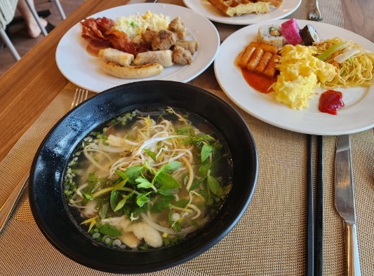 저는 이번 여행에서 현지식을 경험하고 싶어 즉석에서 조리된 쌀국수를 시켰습니다. 신선하고 탱글탱글한 면발이 입에 착 감기며, 신선한 맛을 느낄 수 있었습니다. 친구는 현지식이 물린다며 김밥, 초밥, 떡볶이를 가져와 먹었는데, 푸꾸옥 베스트웨스턴 리조트에서는 한식 메뉴도 준비되어 있어 현지 음식이 입맛에 맞지 않더라도 걱정 없이 배부르게 식사할 수 있습니다.