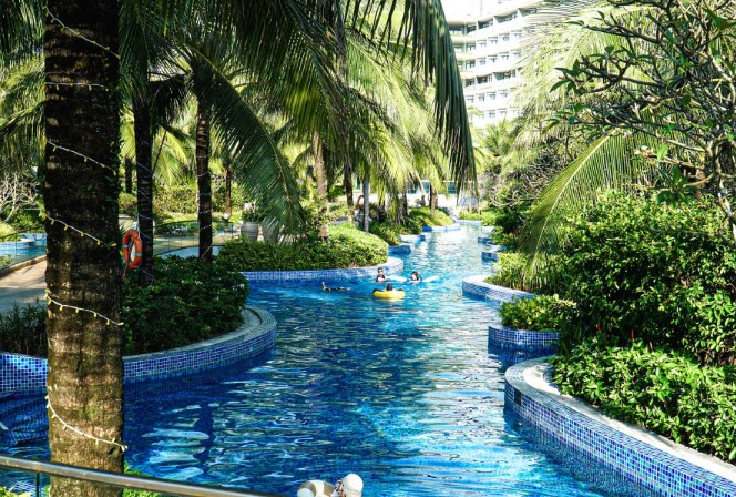 리조트 내 공영풀장도 방문해보았습니다. 공영풀장은 훨씬 넓은 규모로, 많은 사람들이 함께 즐길 수 있는 활기찬 분위기가 일품입니다.