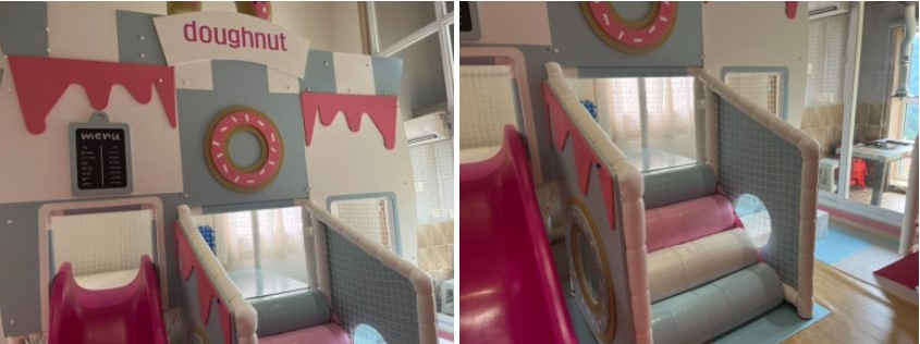 아이들이 들어서자마자 환호성을 지르며 뛰어놀 수 있는 대형 정글짐과 미끄럼틀이 설치되어 있습니다. 마치 키즈카페에 온 듯한 느낌을 주며, 하루가 부족할 정도로 아이들이 신나게 놀았습니다.